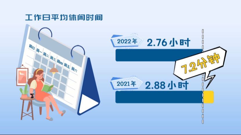 2022-2023年度《中国美好生活大调查》发现,2022年,中国人工作日平均休闲时间为2.76小时,比2021年少了7.2分钟。