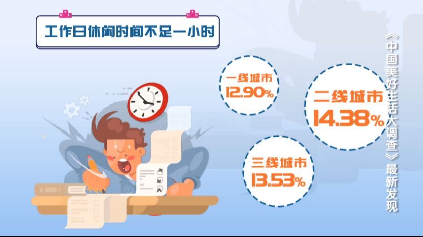 从不同类型城市看,工作日每天休闲时间不足一小时的人群,二线城市占比最高,达到了14.38%。
