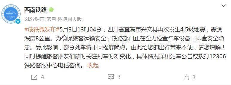 5月3日中午,@西南铁路发布消息,宜宾市兴文县再次发生4.5级地震,为确保旅客运输安全,铁路部门正在全力检查行车设备,排查安全隐患。受此影响,部分列车将不同程度晚点。详情如下: