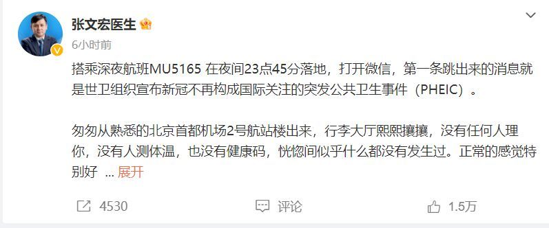 搭乘深夜航班MU5165 在夜间23点45分落地,打开微信,第一条跳出来的消息就是世卫组织宣布新冠不再构成国际关注的突发公共卫生事件(PHEIC)。