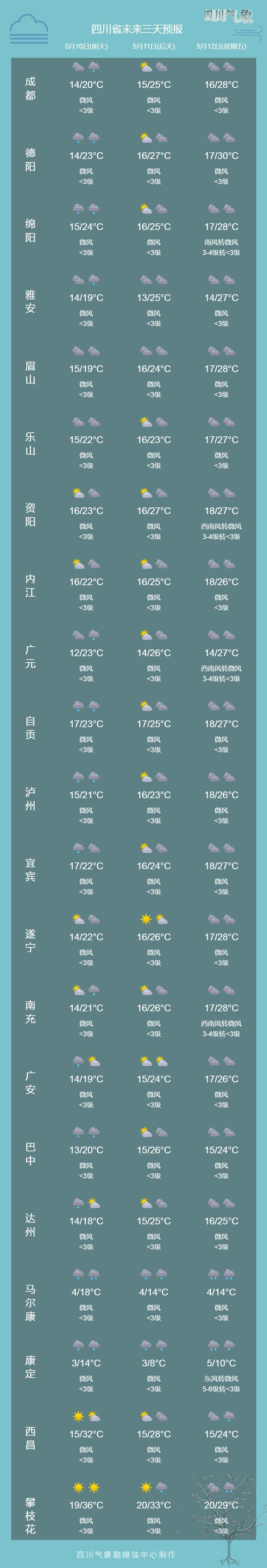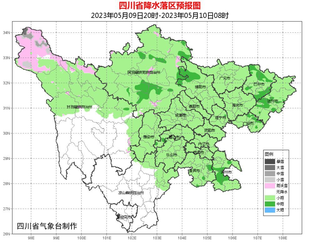 今天晚上:盆地大部阴天有小雨,其中巴中、达州、泸州3市和绵阳西部局部有中雨;阿坝州、甘孜州北部东部和凉山州东北部阴天间多云有阵雨(雪)或雷雨,其中阿坝州的局部地方有中雨,甘孜州和攀西地区其余地方多云间晴。