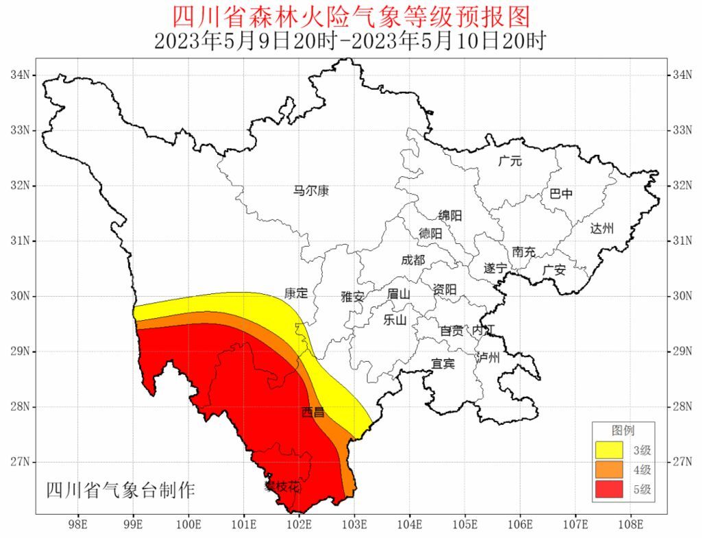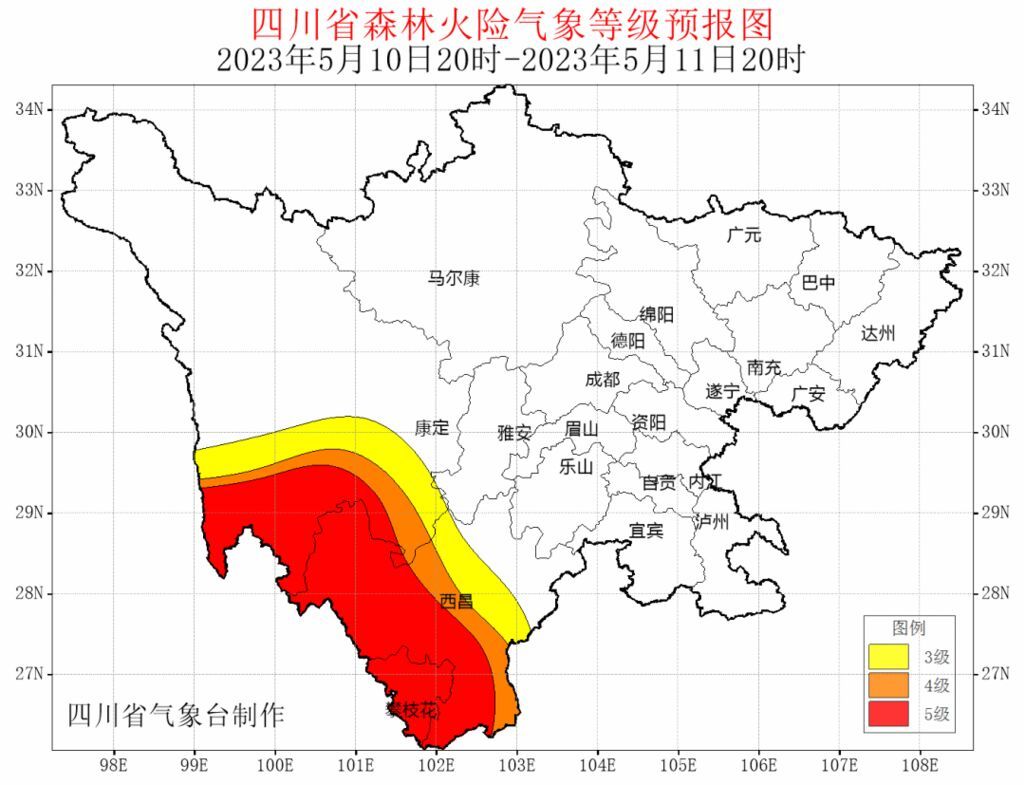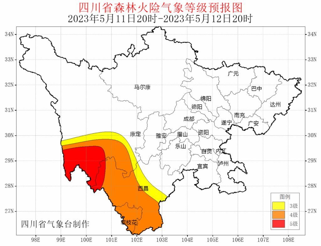 据最新气象资料分析:5月9日20时~11日20时,甘孜州南部和攀西地区西部南部以晴间多云天气为主,气温较高,空气干燥,森林草原火险气象等级大部为4~5级;12日川西高原和攀西地区阴天间多云有阵雨(雪)或雷雨,攀西地区南部有中雨,森林草原火险气象等级大部为3~4级,甘孜州西南部可达5级。请相关州市加强火源管理,做好森林防火工作。