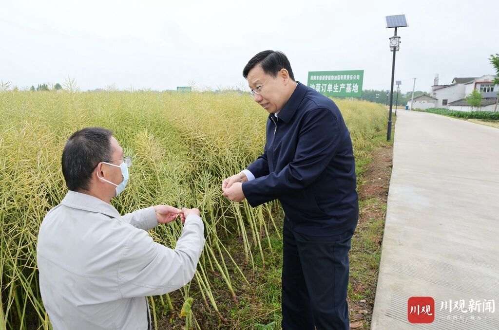 5月9日,省委书记王晓晖到安州区优质粮油现代农业园区调研 ,走进油菜基地向农技员询问油菜收成等情况。
