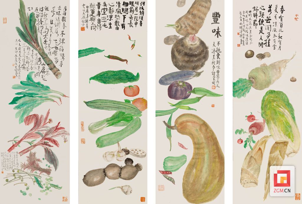 去年夏秋之交,吕三及其家人居西藏八宿三个多月(7月8月9月10月),写下了数万文字、画了500多幅画,佳作尽收入个人画集《七八九十》。画中既有藏地风情,也有院子里的瓜果蔬菜,譬如画上数根萝卜写上“顺气“二字,描上三根茄子写上”下饭菜”。