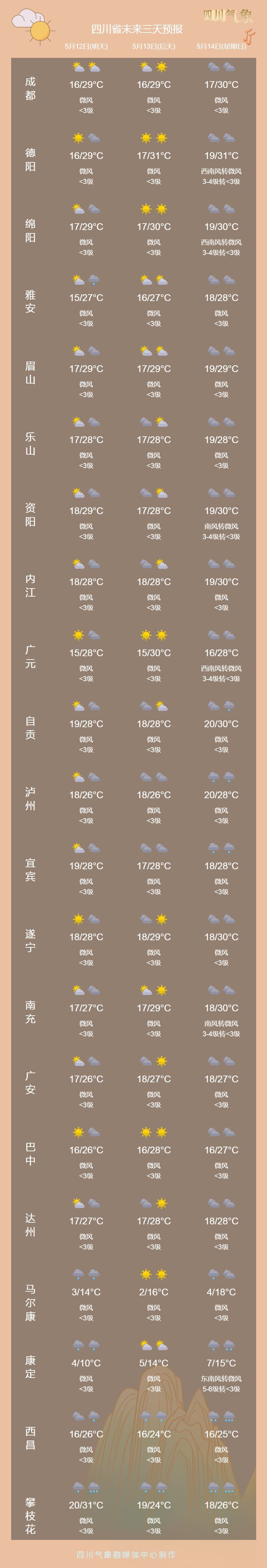 未来三天,盆地大部多云间晴,盆周山区早晚多阵雨,川西高原大部11~12日多阵雨(雪)或雷雨,局部中雨(雪);攀西地区多阵雨或雷雨,南部有中雨,局部地方有大雨。