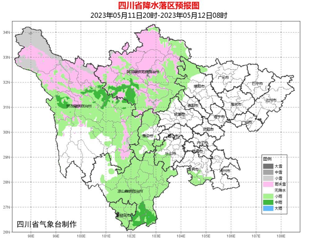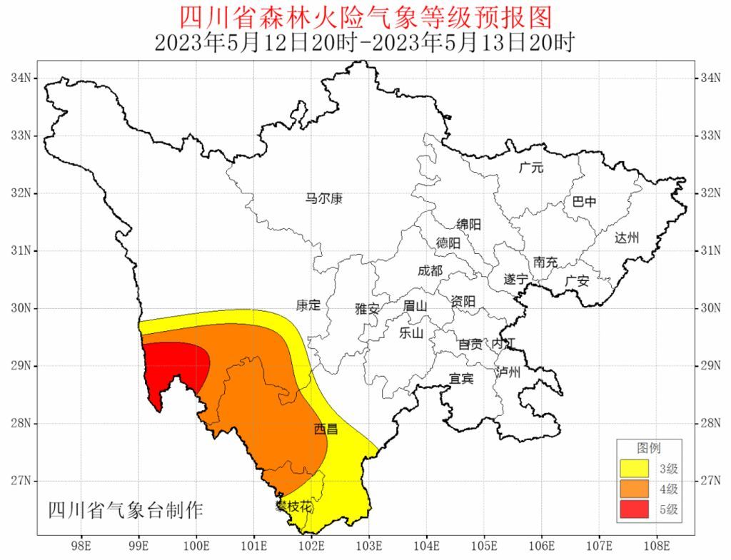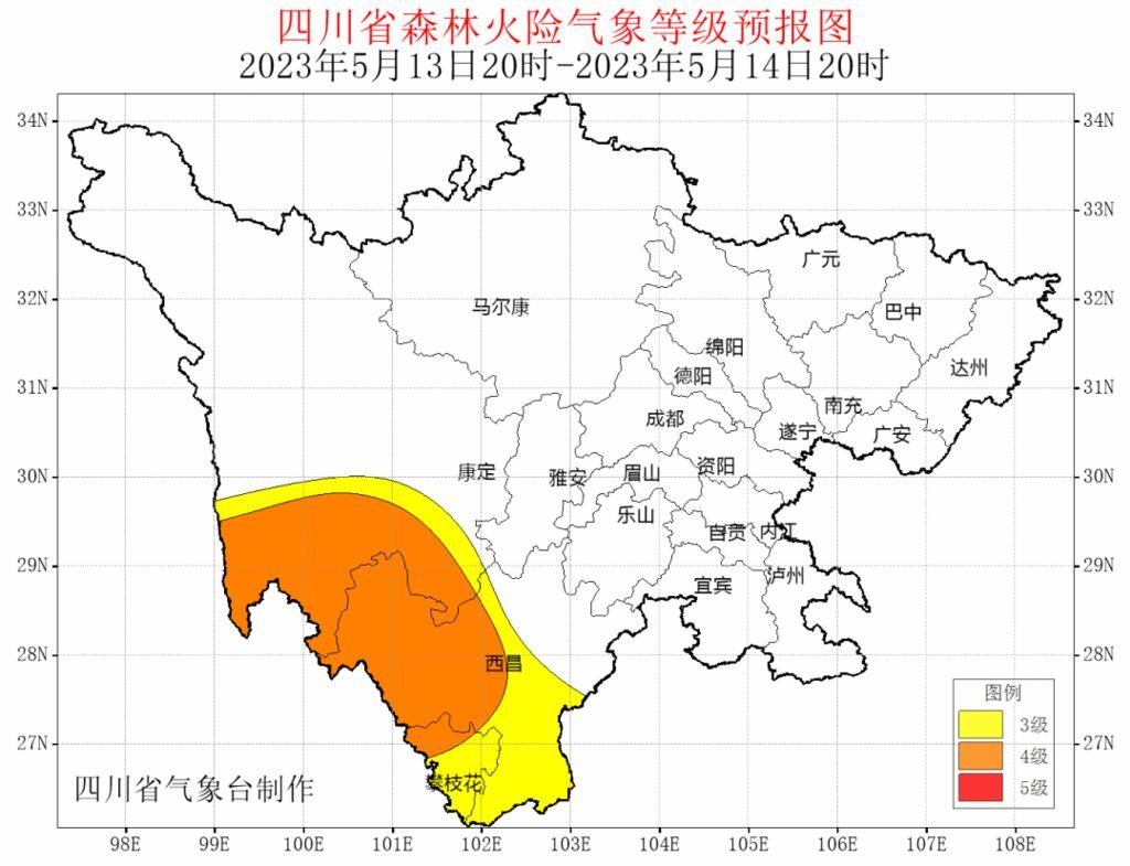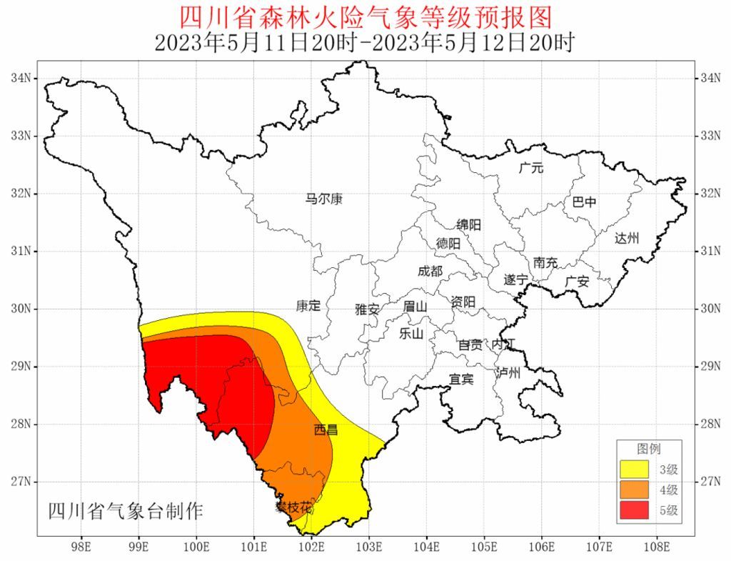 据最新气象资料分析:5月11日20时~14日20时,甘孜州南部和攀西地区多阵雨(雪)或雷雨,其中攀西地区南部有中到大雨,局部暴雨,甘孜州南部局地有中雨,森林草原火险气象等级大部为3~4级,甘孜州西南部可达5级。请相关州市加强火源管理,做好森林防火工作。