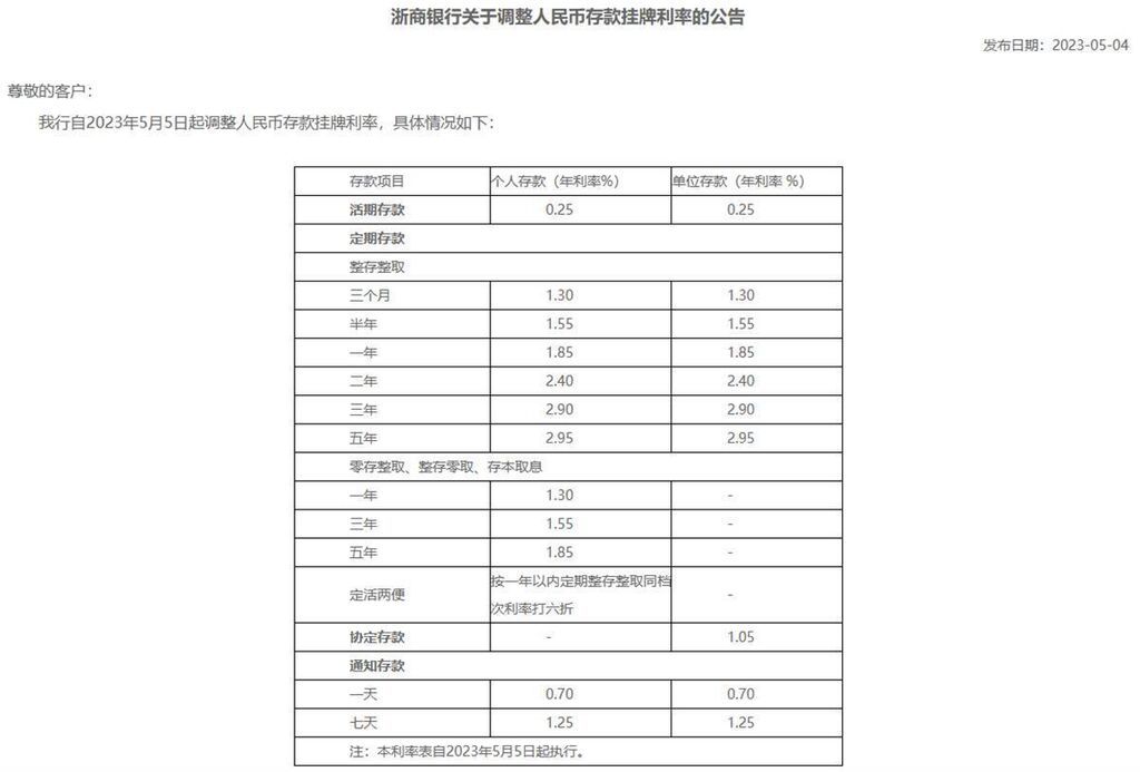 据渤海银行发布的公告显示,自2023年5月5日起,该行活期存款利率由0.35%下调至0.25%,3个月、半年、1年期整存整取利率均下调10个基点至1.33%、1.59%、1.85%,2年期、3年期、5年期整存整取下调25—30基点不等,分别为2.40%、2.95%和2.95%。