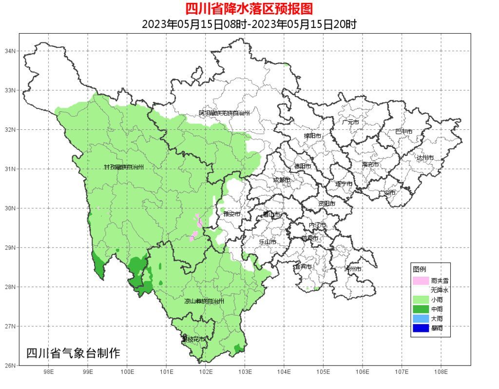 据四川气象,未来三天,盆地大部时段以多云到晴天气为主;川西高原和攀西地区多阵雨或雷雨,15日甘孜州西部和攀西地区西部南部有中雨,局地大雨。