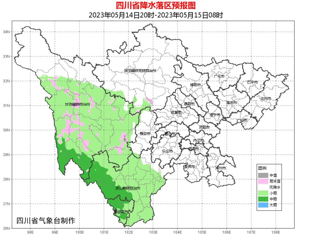 明天白天:盆地各市多云;阿坝州西南部、甘孜州中部南部和攀西地区阴天有阵雨(雪)或雷雨,其中甘孜州西南部和凉山州西北部局地有中雨,川西高原其余地方多云间阴。