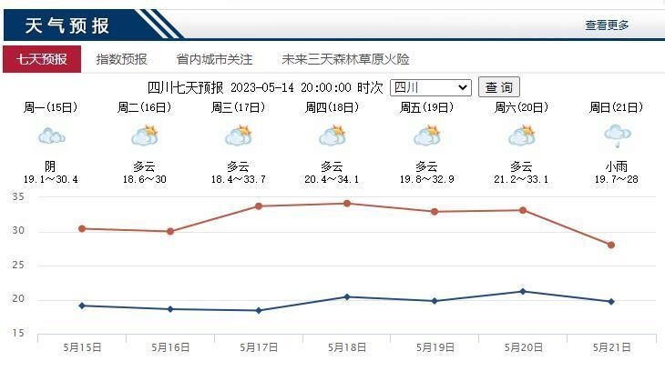 >>19日晚上到20日白天多云,傍晚前后西部山区有阵雨或雷雨,气温20~34℃;