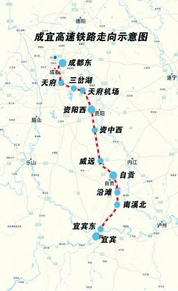 时速350公里的成宜高铁起于成都,经自贡抵达宜宾,与成贵铁路、在建的渝昆高铁相连,计划年内建成开通。届时,将实现成都主城区与成都天府国际机场、成都都市圈与川南城市群的快速连接,并形成成都至昆明、贵阳、广州的高速铁路大通道。