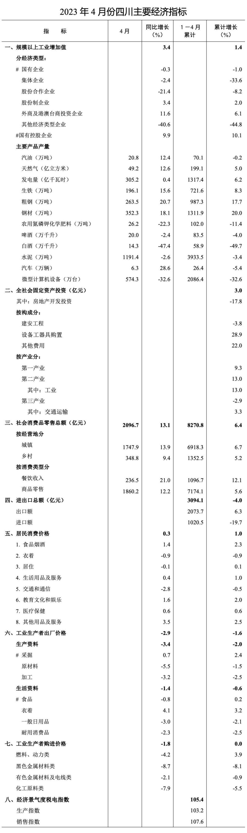 固定资产投资情况,1—4月,全社会固定资产投资同比增长3.0%。分产业看,第一产业投资同比增长9.3%,第二产业投资同比增长13.0%,其中工业投资同比增长13.0%,第三产业投资同比下降2.9%。从房地产开发看,房地产开发投资同比下降17.8%。商品房施工面积同比下降4.6%,商品房销售面积同比下降3.9%。