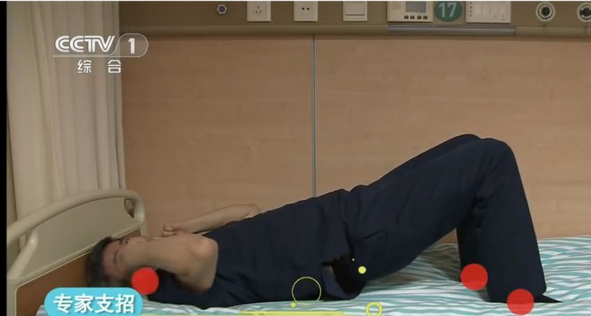 两个脚、两个肘关节,以及后脑勺加起来5个点。仰卧在床上,双腿屈膝,双肘背部顶住床,腹部臀部向上抬起,维持5秒~10秒后放下。依次进行,早晚各1次,每次3组,每组10下。