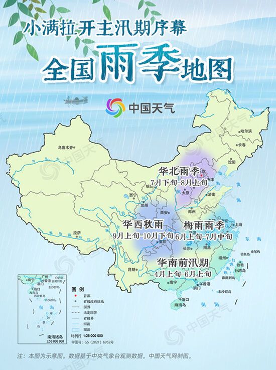 今天(5月21日)迎来小满节气,这是夏季的第二个节气,也是夏季节气中升温速度最快的。此时我国北方由暖变热,南方雨水渐盛,主汛期序幕就此拉开。从全国雨季地图看哪里即将江河水满。