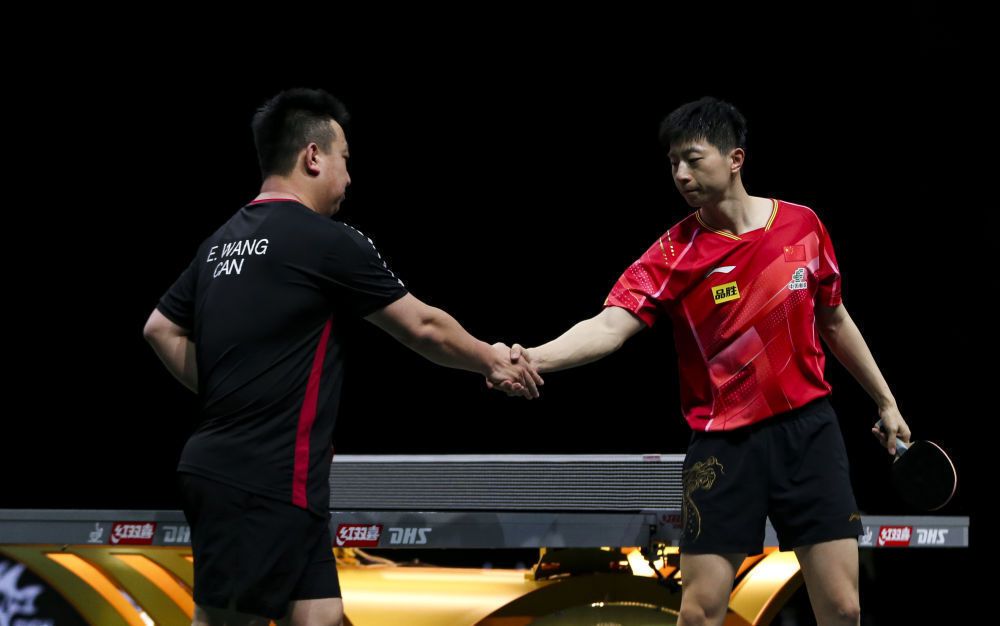 ↑马龙(右)在比赛后与王臻握手致意。新华社记者 张誉东 摄