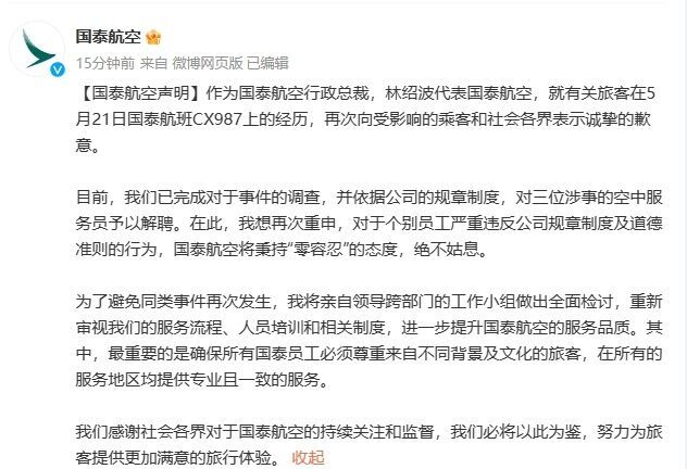 目前,我们已完成对于事件的调查,并依据公司的规章制度,对三位涉事的空中服务员予以解聘。在此,我想再次重申,对于个别员工严重违反公司规章制度及道德准则的行为,国泰航空将秉持“零容忍”的态度,绝不姑息。