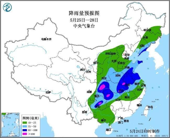 中央气象台预计,5月25日至28日,西南地区东部、西北地区东南部、江汉、江淮、黄淮、华北、东北地区南部等地的大部地区将出现中到大雨,其中,四川东北部、贵州中北部、湖南西北部、湖北东部、河南南部、山东南部和东部、辽宁东部等地的部分地区有暴雨、局地大暴雨。累积降水量有20~40毫米,部分地区50~80毫米,局地100~180毫米。上述部分地区并将伴有短时强降水、雷暴大风等强对流天气。