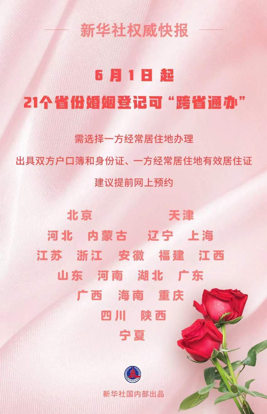 6月1日起,北京、天津、河北、内蒙古、辽宁、上海、江苏、浙江、安徽、福建、江西、山东、河南、湖北、广东、广西、海南、重庆、四川、陕西、宁夏21个省(区、市)将实施内地居民婚姻登记“跨省通办”。