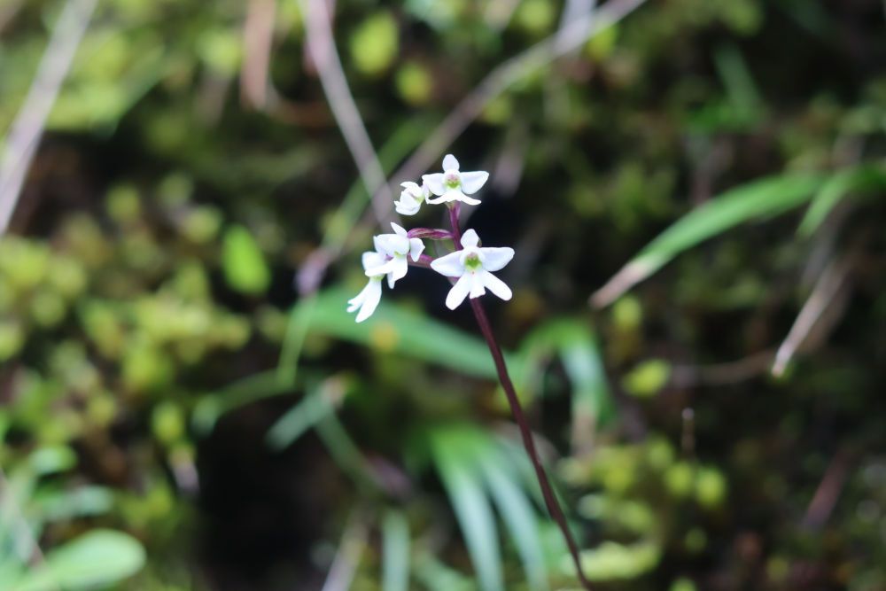 兰科新物种——卧龙无柱兰,2021年11月发表在国际植物学期刊《北欧植物学》上,是程跃红和林红强等人在辖区巡护监测过程中发现的,以模式产地“卧龙”命名。该兰科植物生长在海拔2700米左右的陡峭崖壁上,植株高约19至22厘米,花期为7至8月。茎呈紫红色,开白色小花,中心为绿色。目前仅在大熊猫国家公园卧龙片区发现1个居群,约70株成熟个体,参照IUCN(世界自然保护联盟)的标准,卧龙无柱兰被认定为“极度濒危”等级。
