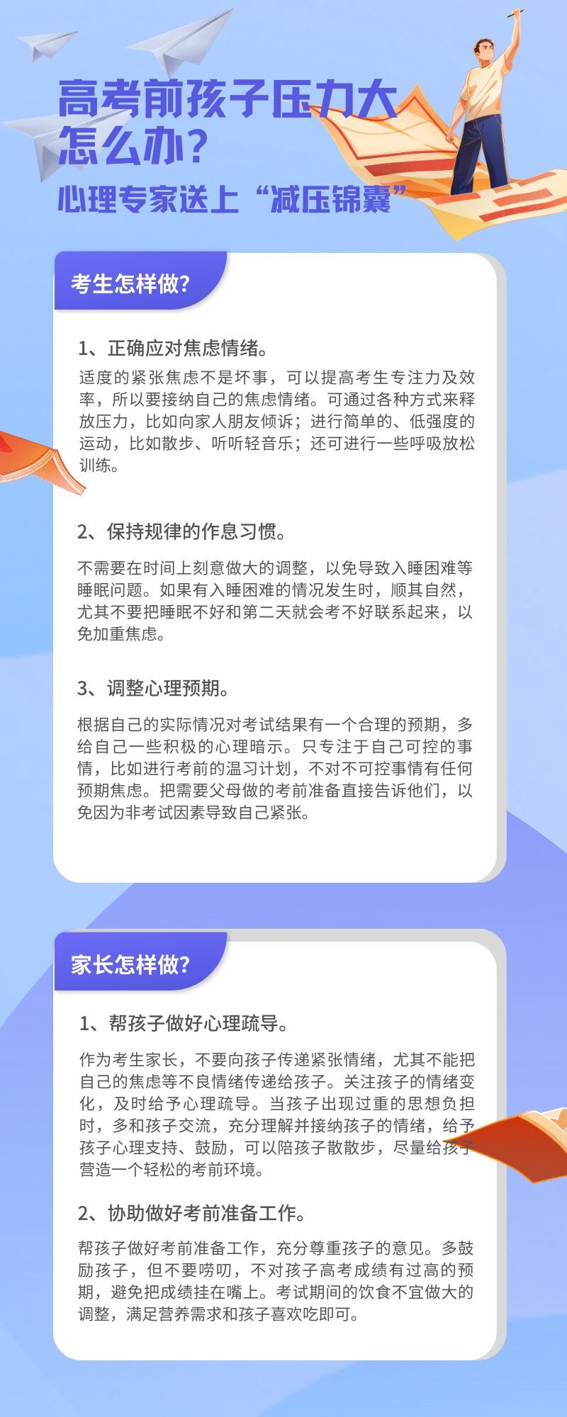 作为考生家长,不要向孩子传递紧张情绪,尤其不能把自己的焦虑等不良情绪传递给孩子。关注孩子的情绪变化,及时给予心理疏导。当孩子出现过重的思想负担时,多和孩子交流,充分理解并接纳孩子的情绪,给予孩子心理支持、鼓励,可以陪孩子散散步,尽量给孩子营造一个轻松的考前环境。帮助孩子做好考前准备工作,充分尊重孩子的意见。多鼓励孩子,但不要唠叨,不对孩子的高考成绩有过高的预期,避免把成绩挂在嘴上。考试期间的饮食不宜做大的调整,满足营养需求和孩子喜欢吃即可。