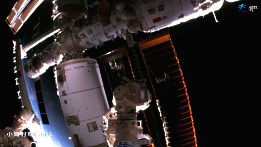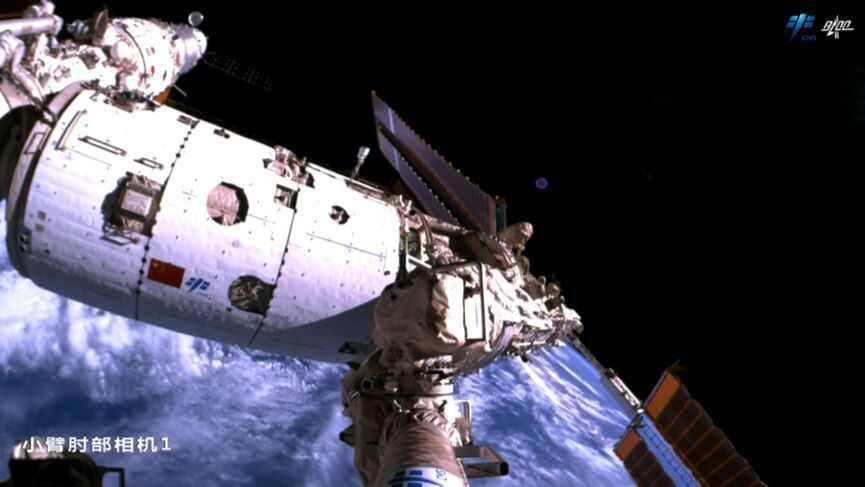 而小臂肘部相机则从多个角度带着大家巡视了浩瀚太空中的空间站,见证了实拍出来的三舱两船构型。