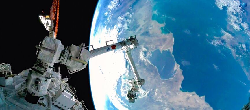 本次直播最大的亮点之一就是通过机械臂第一视角,带大家巡游了中国空间站与地球,近距离感受中国空间站的科技美感与地球的自然之美。本次巡游使用的主要画面为大、小机械臂组合后的小臂肘部相机1的拍摄视场。大机械臂完全伸直状态两根臂杆的展开长度约10.2米,小机械臂的臂长近6米。为了给大家拍出最完整、最好的空间站效果,因此选择了组合臂的形式,以拍摄出空间站三舱两船的构型。