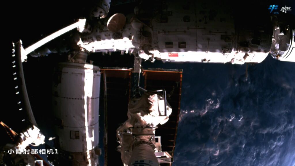 本次直播,小臂肘部相机1首先从梦天舱外国旗凝视点开始拍摄。从这个角度不仅可以看到梦天舱舱壁上的国旗与中国载人航天工程标识,还可以看到远处天和核心舱舱壁上的国旗与工程标。空间站三舱舱壁上均绘制了国旗与工程标,鲜艳的红与沉着的蓝在浩瀚宇宙中交相辉映。