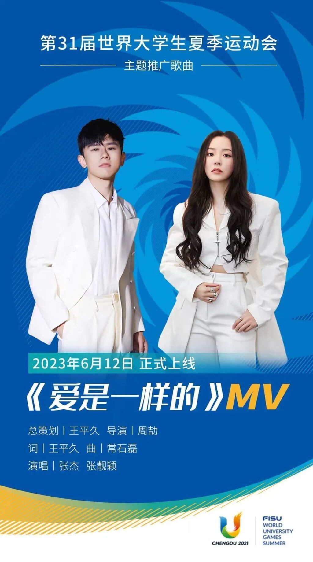 6月12日,成都大运会主题推广歌曲《爱是一样的(Together Forever)》官方MV全球发布!这支MV由张杰、张靓颖倾情演唱并出演。来自世界各地的青年,以赛事与友谊为桥,穿越城市,跨过山海,集聚在体育场,蓄势待发的弦音托举梦想踏上征程!