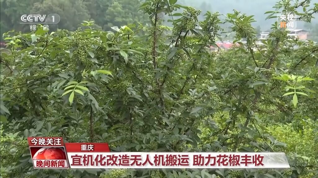 在重庆,多地的花椒迎来收获季。在开州区麻柳乡,曾经的贫瘠荒坡在大力推进土地宜机化改造后,成了可以规模化生产的良田。花椒采摘下来后,马上送到加工车间。在完成烘干、筛籽、过滤等工序后,统一进行包装,随后通过物流销往全国各地,带动上万人增收致富。而在荣昌区天常村,椒农们将采摘好的花椒装进编织袋后,由专人挂在无人机的挂钩上,快速准确地将花椒运送到目的地,有效地克服了丘陵山区花椒运输难的问题。