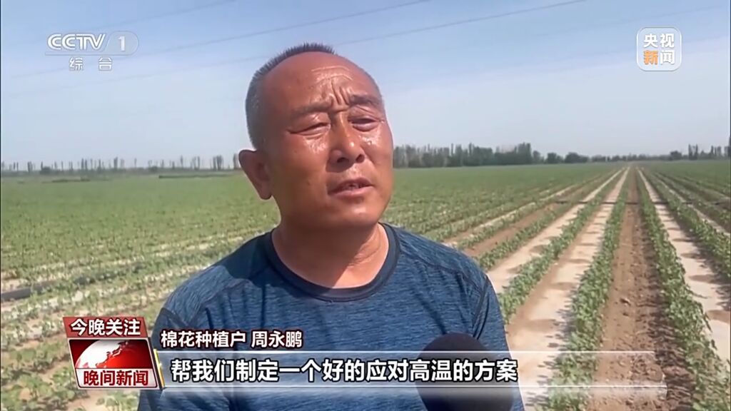 棉花种植户 周永鹏:帮我们制定一个好的应对高温的方案,这两天我们就根据它的大数据、指导方案,我们进行叶面喷施肥料,这样可以起到抗旱作用,把高温造成的危害降到最小。