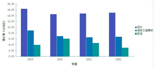 根据四川省死因监测数据显示,四川省2022年18岁以下儿童伤害死亡率为万分之1.35,其中约有36.81%死于溺水;2019—2022年1—14岁组儿童伤害单病种死因首位均为溺水,远高于排在其后的道路交通事故和跌落。