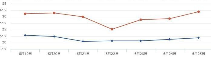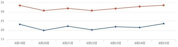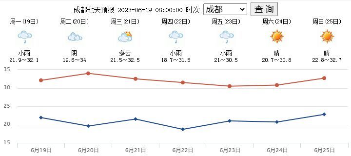 四川省气象台预计,6月19日起,盆地日最高气温普遍超过30℃,中西部部分时段可达35℃或以上。预计直到6月29日,盆地大部地区都是以多云到晴天气为主,盆周山区多分散降水。