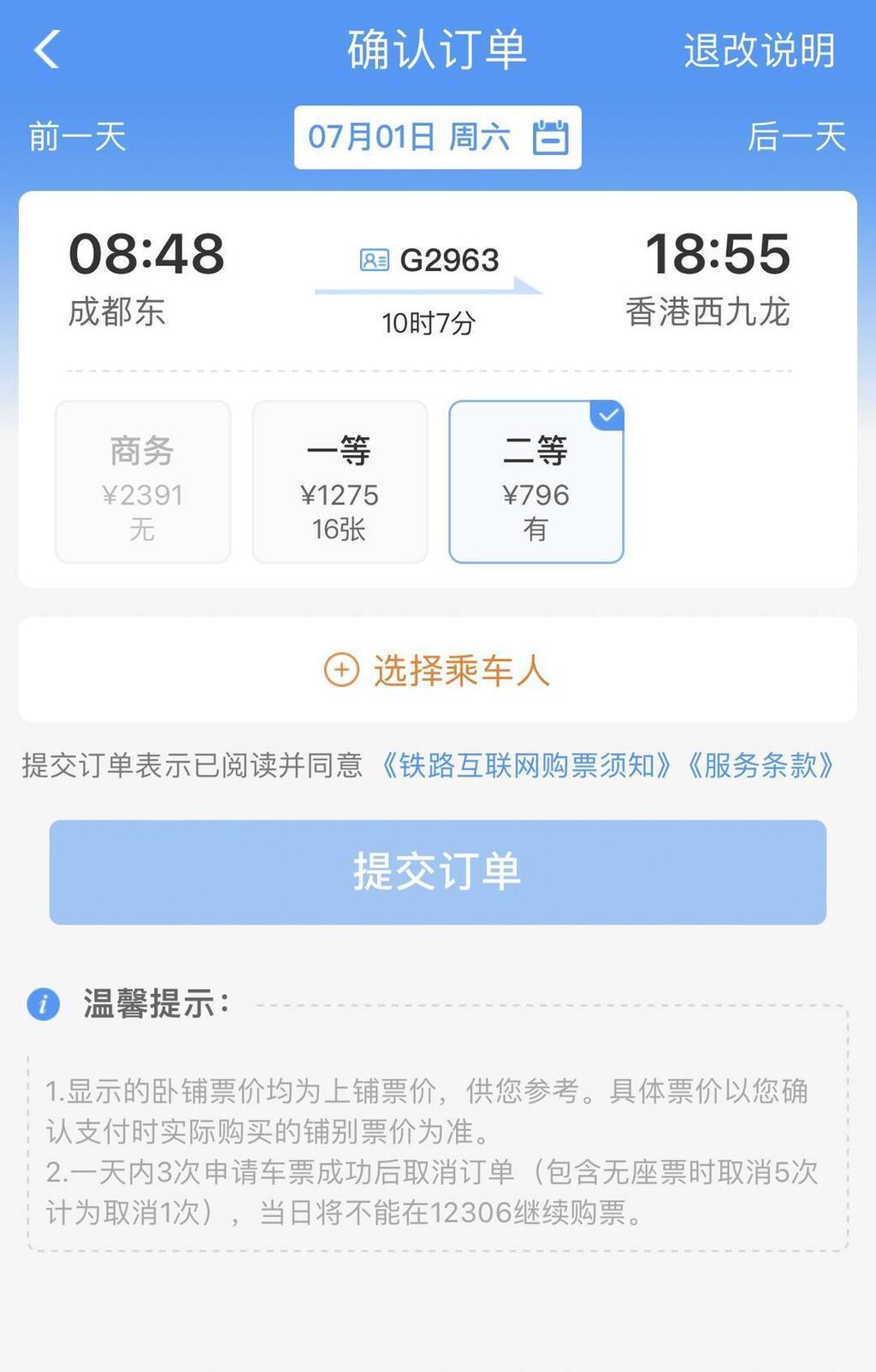 开售仅仅几分钟,7月1日成都东至香港西九龙商务座车票已经售罄,一等座所剩不多,二等座尚有余票。