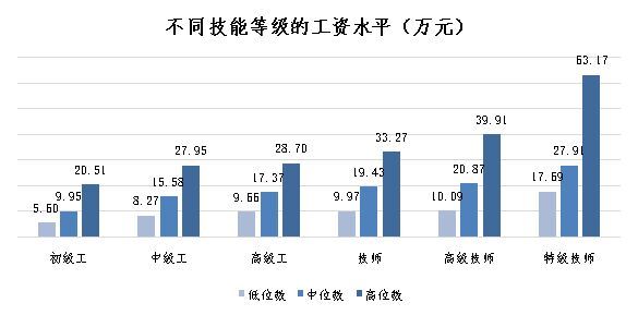 从工资中位数看,首席技师工资超初级工3倍。首席技师、特级技师、高级技师、技师、高级工、中级工和初级工分别为30.33万元、27.91万元、20.87万元、19.43万元、17.37万元、15.58万元和9.95万元。