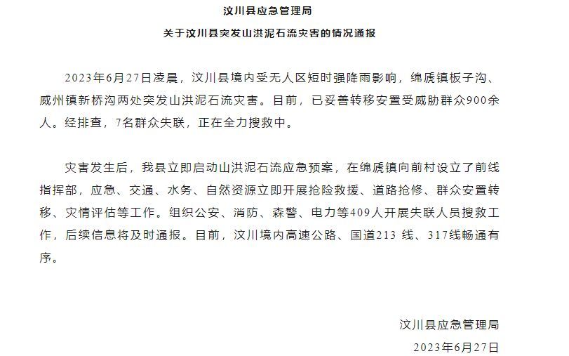 2023年6月27日凌晨,汶川县境内受无人区短时强降雨影响,绵虒镇板子沟、威州镇新桥沟两处突发山洪泥石流灾害。目前,已妥善转移安置受威胁群众900余人。经排查,7名群众失联,正在全力搜救中。