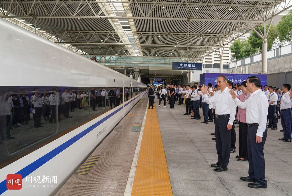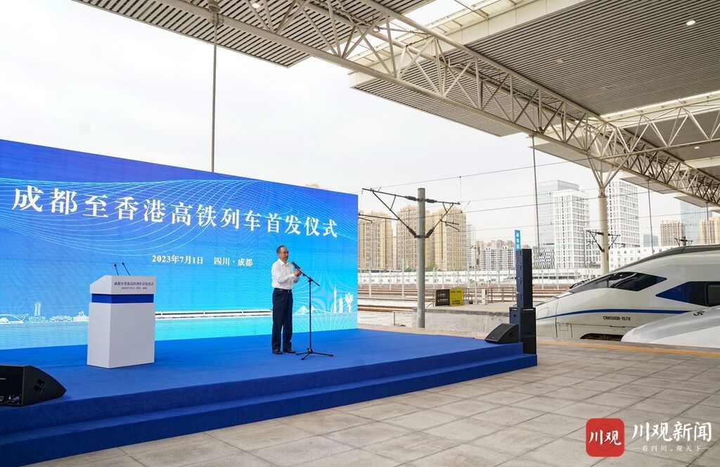 在中国共产党成立102周年和香港回归26周年之际,7日1日上午,成都至香港高铁列车首发仪式在成都东站举行。8时48分,省委副书记、省长黄强宣布:成都至香港高铁列车开通。