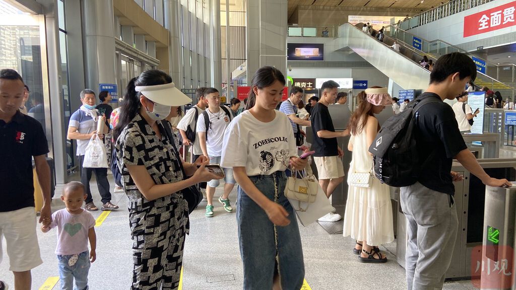 7月5日,记者在成都南站看到,进站口聚集大量旅客,等待出发。其中,有不少家长带着孩子,准备开始暑期旅行。此外,还有部分学生背着书包结伴出行。截至7月4日,暑运前四天,成都南站累计发送旅客12万人次,与6月同期相比增长了11.3%。