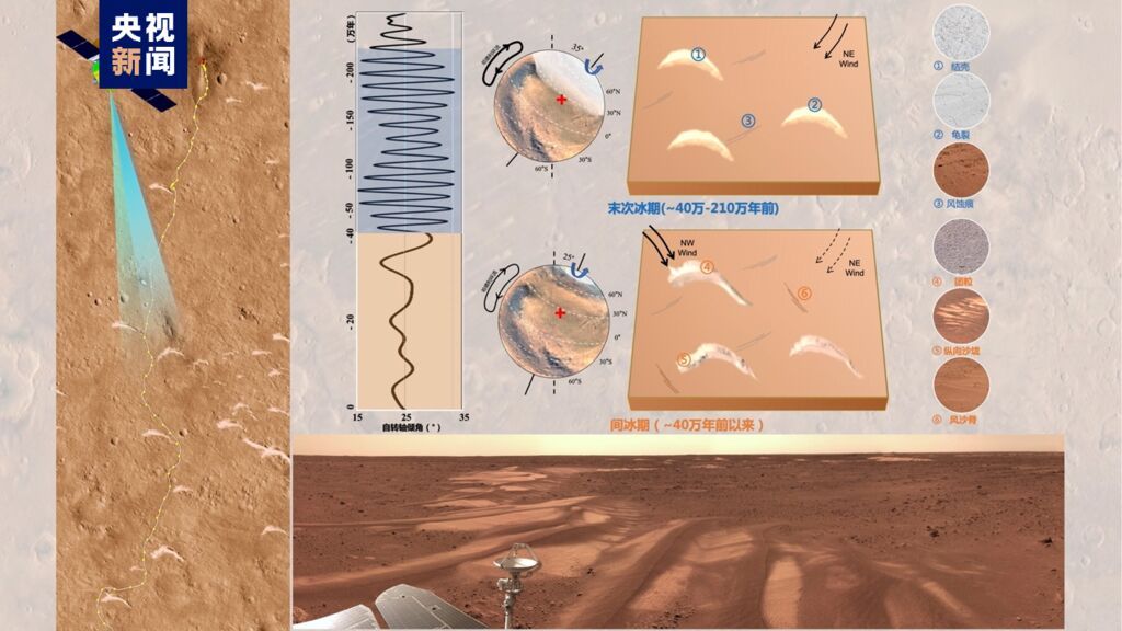 针对这一科学问题,中国科学院国家天文台李春来团队,联合中国科学院地质与地球物理所郭正堂团队、中国科学院青藏高原所、美国布朗大学和天问一号任务工程团队,瞄准火星乌托邦平原南部丰富的风沙地貌,利用环绕器高分辨率相机、火星车导航地形相机、多光谱相机、表面成分分析仪、气象测量仪等开展了高分辨率遥感和近距离就位的联合探测,提取了沙丘形态、表面结构、物质成分等信息,分析了其指示风向和发育年龄,发现了着陆区风场发生显著变化的层序证据,并与火星中高纬度分布的冰尘覆盖层记录有很好的一致性,揭示了祝融号着陆区可能经历了以风向变化为标志的两个主要气候阶段,风向从东北到西北发生了近70度的变化,风沙堆积从新月形亮沙丘转变为纵向暗沙垄。这一气候的转变,发生在距今约40万年前的火星末次冰期结束时,可能是由于自转轴倾角的变化,火星从中低纬度到极地地区,发生了一次“冰期-间冰期”的全球性气候转变。该项研究有助于增进我们对火星古气候历史的理解,为火星古气候研究提供了新的视角,也为地球未来的气候演化方向提供了借鉴。