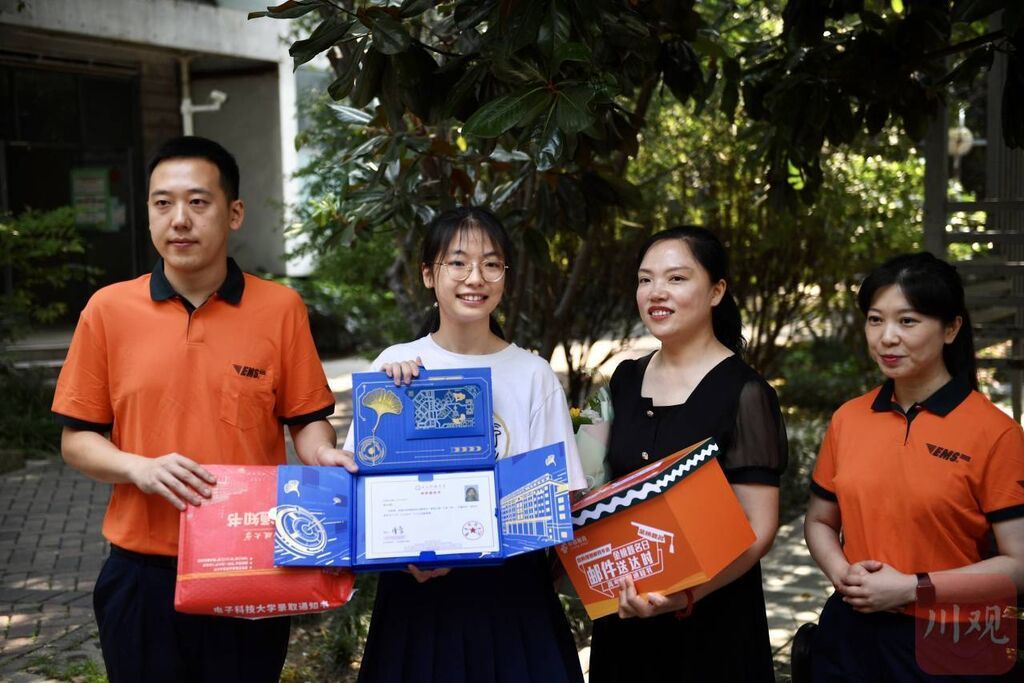 “赵心怡同学,你的高考录取通知书到了,祝贺你,请签收!”7月8日9点57分,迎着骄阳热浪,四川邮政投递员刘翔、谭静手捧鲜花为赵心怡送上了从电子科技大学发出的高考录取通知书。这是今年四川省第一封高考录取通知书。