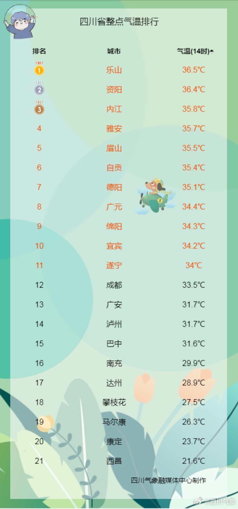 今天,四川盆地又是被高温炙烤的一天。看看今天14时,四川部分城市的实况气温: