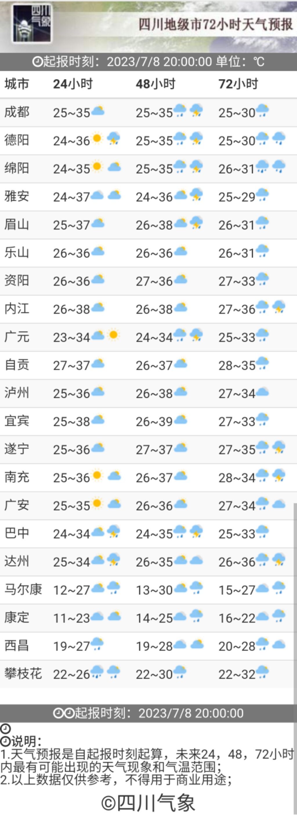 根据最新气象资料分析,四川省气象台预计,7月11日~15日,全省有一次明显的雷雨或阵雨天气过程,雷雨时伴有短时阵性大风,盆地部分地方有大雨到暴雨,局部大暴雨,累计雨量普遍有40~80毫米,局部120~180毫米,个别可达250毫米或以上;川西高原和攀西地区有中雨,局部大雨到暴雨(累计雨量25~60毫米)。