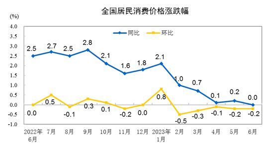 2023年6月份,全国居民消费价格同比持平。其中,城市持平,农村下降0.1%;食品价格上涨2.3%,非食品价格下降0.6%;消费品价格下降0.5%,服务价格上涨0.7%。1—6月平均,全国居民消费价格比上年同期上涨0.7%。