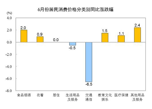 6月份,全国居民消费价格环比下降0.2%。其中,城市下降0.2%,农村下降0.2%;食品价格下降0.5%,非食品价格下降0.1%;消费品价格下降0.3%,服务价格上涨0.1%。