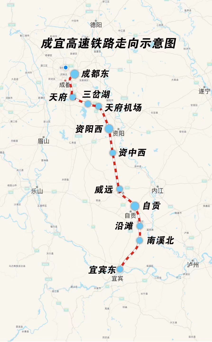 成宜高铁是国家“八纵八横”高速铁路网“京昆通道”的重要组成部分,线路从成都引出,经自贡抵达宜宾,全长约260公里,设计时速350公里,由蜀道集团参与投资,成兰铁路公司建设管理;沿线共设11个车站,分别为成都东、天府、三岔湖、天府机场、资阳西、资中西、威远、自贡、沿滩、南溪北、宜宾东。