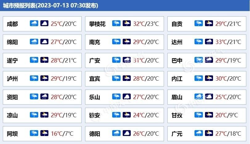 今明天(7月13日至14日),四川仍有大范围降雨,盆地雨势较强,局地有暴雨。近期,四川盆地降雨频繁,需警惕叠加降雨的致灾性,公众需关注预警预报信息,尽量避免在暴雨时段出行,注意交通安全。
