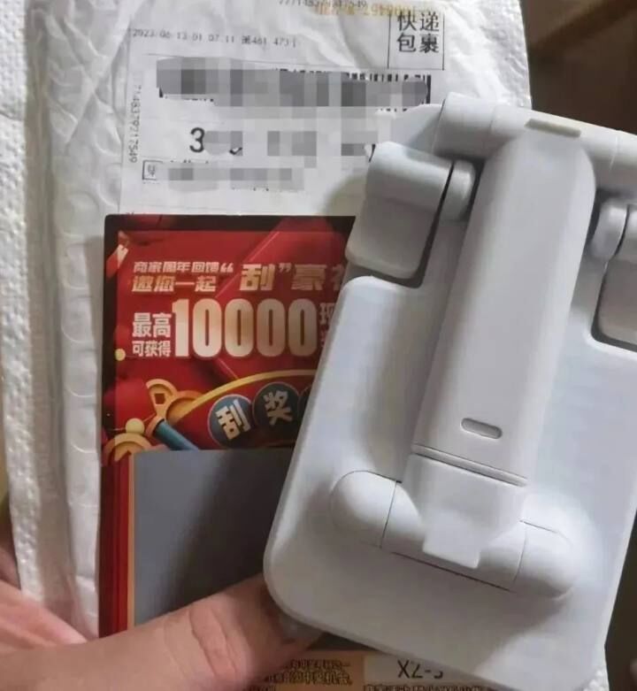 最近,又有网友称收到了莫名其妙的快递,里面竟然是一张刮刮乐和一个手机支架,刮刮乐上有兑奖二维码。