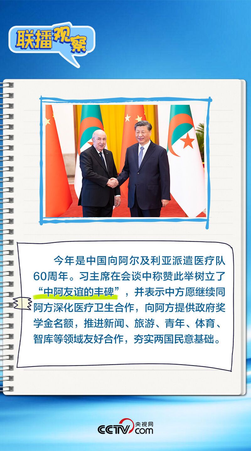 会谈中,习主席特别提到,今年是中国向阿尔及利亚派遣医疗队60周年,并称赞此举树立了“中阿友谊的丰碑”。中阿传统友谊深厚,两国始终相互尊重、平等相待、彼此支持,缔造了一段段友好交往的佳话。