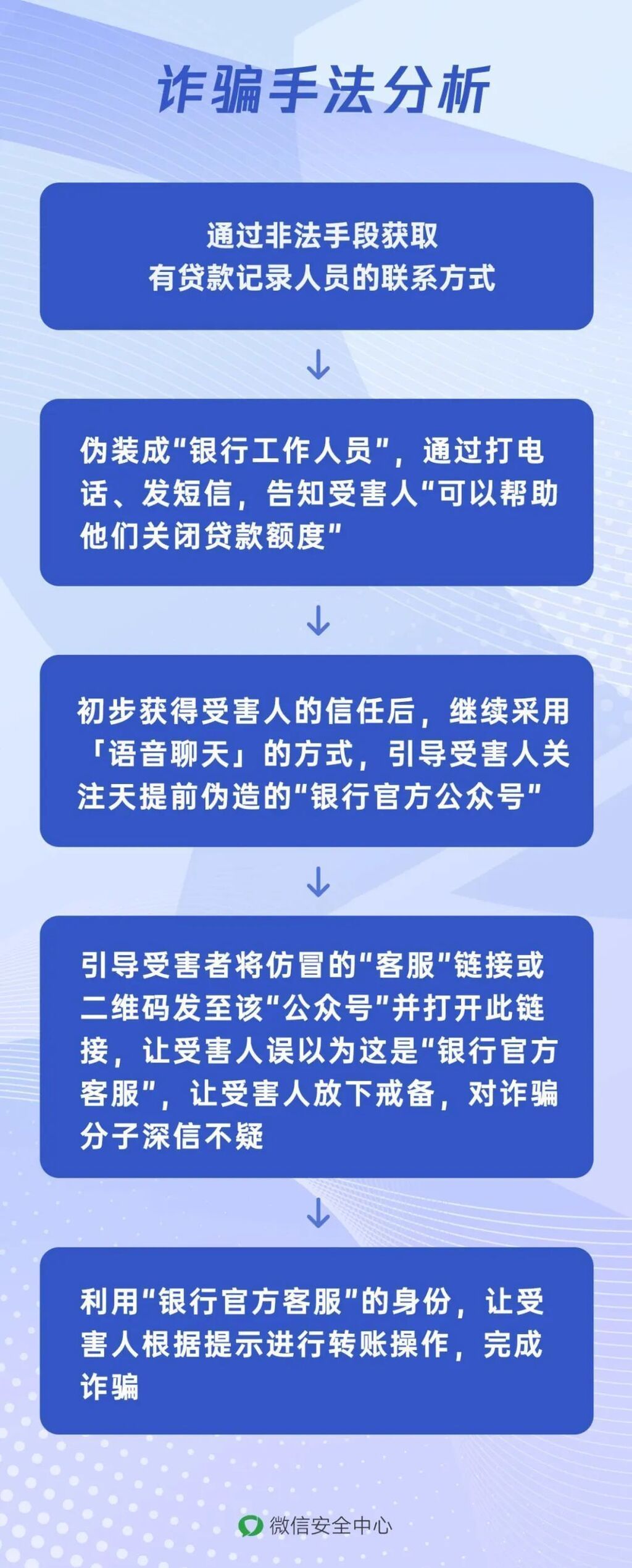 微信团队称,近期,平台发现有诈骗团伙向用户发送诈骗短信,以可以抹除网贷额度、修复征信等为噱头,在沟通过程中要求用户先关注银行等机构的官方公众号,引导用户将仿冒的“中国人民银行征信中心”“中国银保监会”等官方客服链接或二维码发送到该公众号内并点击打开,部分用户误认为该欺诈链接就是相关公众号的官方客服,从而上当受骗。