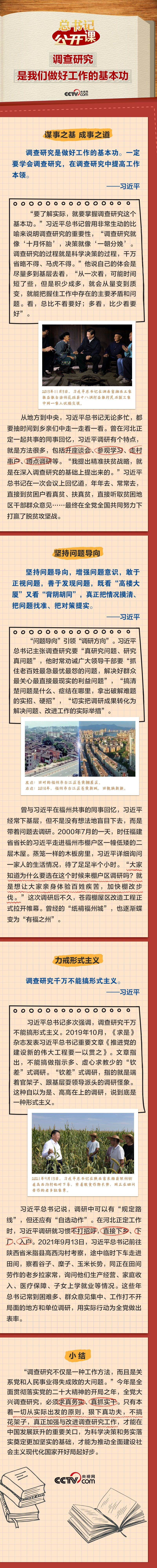 “调查研究是谋事之基、成事之道,没有调查就没有发言权,没有调查就没有决策权。调查研究是我们做好工作的基本功。”习近平总书记非常重视调查研究,并一以贯之身体力行、率先垂范,推动全党大兴调查研究之风。本期《总书记“公开课”》聚焦总书记关于调查研究的所思所言所行,让我们一起学习领会。