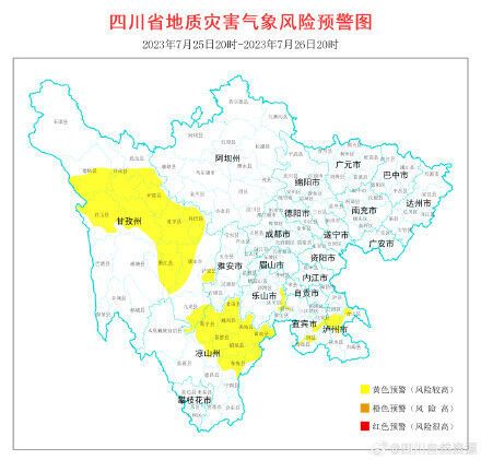 根据四川省地质环境条件,结合四川省气象台天气预报情况,7月25日20时至7月26日20时,全省地质灾害气象风险预警结果如下: